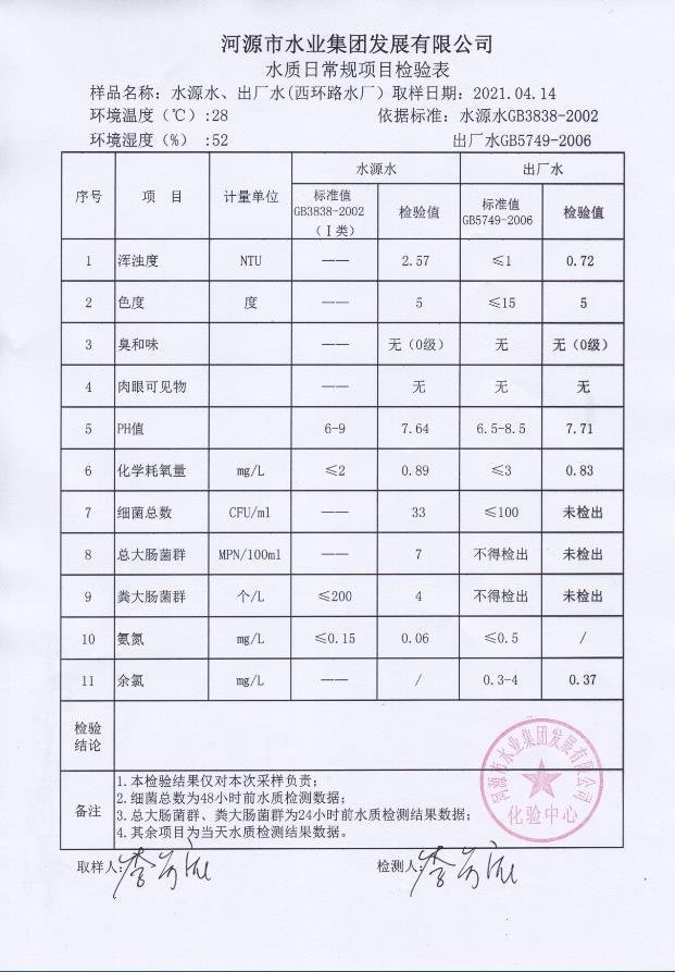2021年4月14日水质检验报告